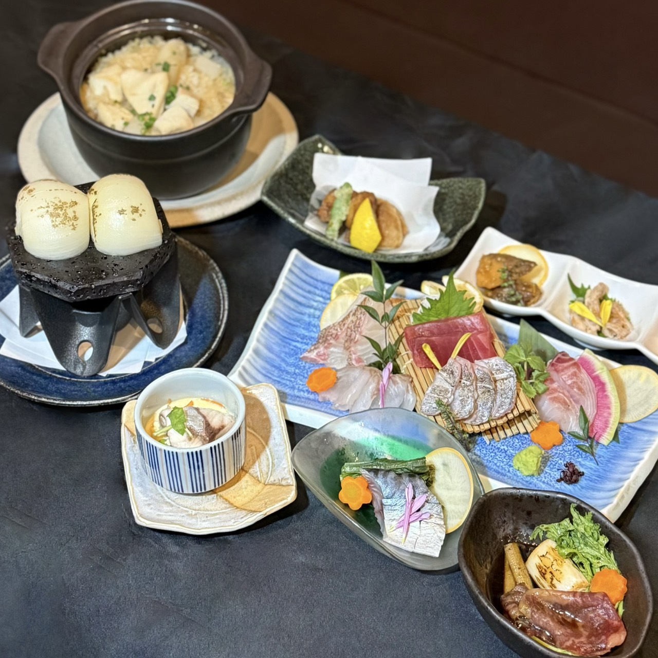 *食材の仕入れによりメニューが変更になる場合があります 【先 付】ひとくち出汁 おつまみ3種盛り 【お造り】お造り4種盛り 【名 物】淡路玉ねぎの溶岩焼き 【揚 物】ホタルイカの磯部天ぷら 【蒸し物】春キャベツの信田蒸し 桜海老の琥珀餡 【焼 物】えびすもち豚塩麴炙り焼き 【食 事】桜鯛と菜の花の土釜飯 【甘 味】本日の甘味 |